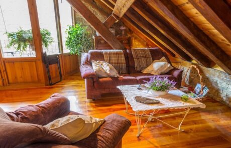 - Salón abuhardillado con chimenea.